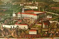 Through its history, the monastery and the town had a checkered history, suffering damage from warfare and fire.[1] There was a fire in the monastery in 1512. In 1701 a major fire caused by lightning destroyed the monastery. It was rebuilt in 1717–27.[2] The former Gothic church also suffered great damage, and in 1726 it was decided to erect a new building. The fantastically ornamented monastery church was designed and built in 1726–40.[1]