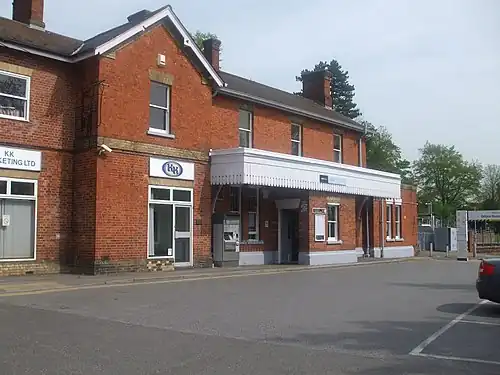 The first station at Otford opened on 1 June 1874. It was located at the point where the lines to Bat & Ball and Maidstone diverge (TQ534584). It was purely an exchange station, with no access for the villagers of Otford. The station closed on 1 November 1880.[1] The current Otford station opened on 1 August 1882.[2] It was renamed Otford Junction in 1904, reverting to its original name on 7 July 1929.[3] The station had two through platforms and a bay platform, which was used by shuttle trains to Sevenoaks (Tubs Hill).[4] The yard had two sidings, one of which served a goods shed.[5] Freight facilities were withdrawn on 7 May 1962.[6]