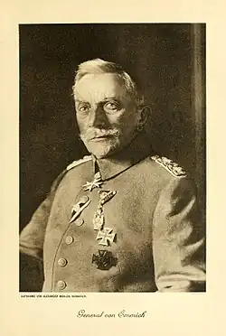 The corps halted offensive operations in mid-September and was transported back to the Western Front.[34] Emmich took ill, however, and was forced to pass command of his corps to Walther Freiherr von Lüttwitz. Emmich died three months later, on 22 December 1915.[35]