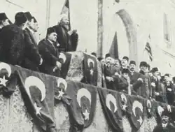 In 1908, the Young Turks seized power in Constantinople and installed Sultan Mehmed V as a figurehead in 1909.[7][10] The new regime implemented a program of reform to modernise the Ottoman political and economic system and to redefine its racial character. The Young Turks restored the Ottoman constitution of 1876 and reconvened the Ottoman parliament, which effectively started the Second Constitutional Era. The Young Turk movement members, which was once underground, established declared political parties.[11] Among them were major parties the Committee of Union and Progress (CUP) and the Freedom and Accord Party, also known as the Liberal Union or Liberal Entente (LU). A general election was held in October and November 1908 in which the CUP became the majority party.