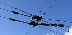 Trams draw their power from a single overhead wire at about 500 to 750 V DC. Trolleybuses draw from two overhead wires at a similar voltage, and at least one of the trolleybus wires must be insulated from tram wires. This is usually done by the trolleybus wires running continuously through the crossing, with the tram conductors a few centimetres lower. Close to the junction on each side, the tram wire turns into a solid bar running parallel to the trolleybus wires for about half a metre. Another bar similarly angled at its ends is hung between the trolleybus wires, electrically connected above to the tram wire. The tram's pantograph bridges the gap between the different conductors, providing it with a continuous pickup.