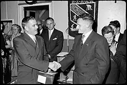 Frank Sharpley presenting Arthur Lydiard with a return ticket for the 1960 Summer Olympics at the 1960 Owairaka Amateur Athletic Club prizegiving