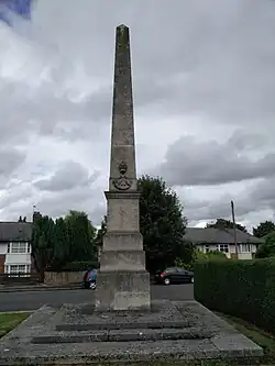 The memorial consists of a single obelisk sat on a moulded pedestal and a plain square base and, typically for Lutyens' war memorials, it rises centrally from three shallow steps. The only relief on the obelisk is a carving of the regimental cap badge—described by Historic England as "immediately announcing the identity of those commemorated"—on two of the faces. The west face of the base bears the inscription "TO THE GLORIOUS MEMORY OF 5878 OF ALL RANKS OF THE OXFORDSHIRE AND BUCKINGHAMSHIRE LIGHT INFANTRY WHO FELL IN THE GREAT WAR"; this was supplemented later by an inscription on the east face: "TO THE GLORIOUS MEMORY OF 1408 ALL RANKS OF THE OXFORDSHIRE AND BUCKINGHAMSHIRE LIGHT INFANTRY WHO GAVE THEIR LIVES IN THE SECOND WORLD WAR 1939 – 1945". The dates of the First World War are inscribed on the other two faces in Roman numerals: MCMXIV on the north and MCMXIX on the south.[1] The obelisk is similar to the Lancashire Fusiliers War Memorial, also an obelisk dedicated to an individual regiment located in Bury in the north-west of England, but is described by author Tim Skelton as being a "much plainer" design.[2]