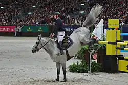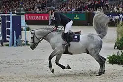 Most of his career as a sport horse was spent with a little-known young rider, Sébastien Duplant.[6] This young rider took Pégase from Reynald Gras's stables in Aix-en-Provence at the age of 7,[8] when he was suffering from tendonitis and hadn't jumped for a year,[6] following a series of bad experiences.[8] At first, the stallion was not very trusting and didn't open up.[6] Sébastien Duplant took part in national show jumping competitions every weekend, before progressing to the 2 and 3 star international show jumping competitions (CSI2* and CSI3*).[5] Noting that Pégase du Mûrier was the best horse in his stable, Duplant worked on him for a long time.[6] This gray stallion enabled the previously little-known Sébastien Duplant to "move from the shadows into the light",[6] forming one of the most talked-about French rider-horse pairs of the 2013 and 2014 seasons.[4][10] The pair won the Grand Prix 3 étoiles (CSI3*) de la ville de Vichy in July.[11] Highly gifted, Pégase du Mûrier garnered a great deal of praise, particularly after the 2014 French Pro Elite runner-up title,[5] which was a surprise, if not a revelation, on the French show jumping circuit in 2014, as it was the couple's first appearance at this level of competition.[8] The gold medal eluded Sébastien Duplant due to a fault in the first round.[8] His horse nevertheless attracted the attention of various investors.[6]