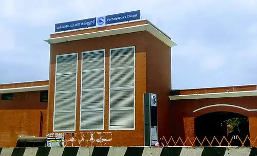 Pachaiyappa's College is an underground metro station on the South-East Corridor of the Green Line of Chennai Metro in Chennai, India. This was inaugurated on 14 May 2017. The station will serve the neighbourhoods of Kilpauk and Aminjikarai. The station has four entry and exit points.[1]