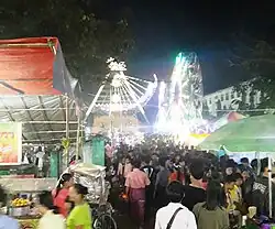 Pagoda festivals (Burmese: ဘုရားပွဲ; paya pwe) are regular festivals found throughout Myanmar that commemorate major religious events in pagoda's history, including the founding of a pagoda and the crowning of the pagoda's hti (umbrella).[1] Pagoda festivals are dictated by the Burmese religious calendar and often are held several days at a time. Major events in a pagoda festival typically do not coincide with Uposatha (Buddhist Sabbath) days, during which pious Buddhists observe the Eight Precepts.[1] The majority of pagoda festivals are held during the dry season, from the months of Tazaungmon (November) to Tabaung (March).[2] During the full moon day of Tabaung (Magha Puja), Buddhist devotees in various parts of Myanmar also celebrate sand pagoda festivals.