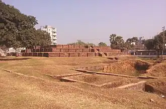 The palace or mound of King Harishchandra remained buried under the ground until the end of the 19th century. The local people identified this buried place as the Rajbari Dhibi.[1] In 1918, Dr. Nalinikanta Bhattasali conducted an archaeological excavation in the village of Rajasana, near the Rajbari-Dhibi.[3][1] As a result of this excavation, some artifacts related to Buddhist religion and culture and imitation coins of the Gupta dynasty were discovered.[3] This led to the identification of Buddhist statues there. Based on this, excavations were conducted in the palace dhibi of Raja Harishchandra in 1990-1991.[4]