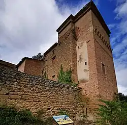 The Medieval fortress of Igúzquiza was partially demolished and rebuilt in brick, with a palatial character.[6] This ancient castle, rebuilt as a palace in the middle of the 15th century by Ferran Vélaz de Medrano y Ruen, preserves the large courtyard of arms, with its low battlemented walls flanking its entrance, rising in its southeast corner a high square tower, rebuilt in that century on a base of ashlar and the rest of brick. In the northeast corner, there is another stone tower, of lesser elevation at present, covered with ivy, preserving between them. The north side of the castle consists of large stables, dismantled rooms, and other dependencies, among which there is a small oratory, with a dark oil painting, a spacious kitchen with its carved stone fireplace, a spiral staircase, and thick walls, which denote the strength of such a fortress.[6]