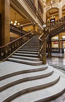 Inside, the marble floors and shelves combine with bronze and iron window frames manufactured in Florence, Italy.[3] The main stairway is characterized by two separate ramps that come together to form a landing. They also seem to cross on the second landing above, after which each move off in their own direction.[5] The meeting room contains frescos by Bartolomé Gallotti painted over a base of 24 carat gold, with themes relating to the history of written communication and the sending of messages.[3]