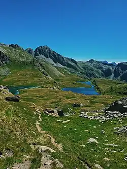 This area consists of several lakes, all of which were formed through glacial excavation: Lac Long (2,720 m (8,920 ft), located below the Bussola Pass, French for "Long lake"); Lac Potcha (2,518 m (8,261 ft)), which is located at the foot of the Palasinaz hill. The view from the Lac Potcha is wider than the view from the other lakes due to its higher altitude; Lac du Couloir (2,606 m (8,550 ft), French of "Corridor Lake"), whose waters, together with those of Lac Vert (2,485 m (8,153 ft), French for "Green Lake"), flow into the Lac de la Bataille (2,485 m (8,153 ft), French for "Lake of the Battle"). This last lake is the largest of the group and is characterized by a trapezoidal shape and a large promontory that almost divides the entire lake in two.[1] The Lac du Couloir (2,606 m [8,550 ft]) is located in a small glacial excavation basin.[2]