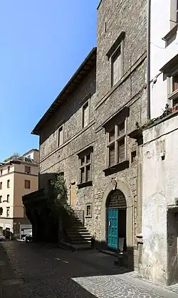 The initial palace, originally a fortified medieval house with a tower, was refurbished by the militant Cardinal Raniero Capocci circa 1230–1240. While the Cardinal became a fervent Guelph, he had hosted both Pope Gregory IX in 1236 and Emperor Frederick II in 1240 at this palace. Frederic would besiege the city in 1234, and it would be successfully defended under the leadership of Capocci. In 1247, Frederick of Antioch, the illegitimate son of the emperor, had recaptured the city, and this led to the palace falling nearly to ruin.[1]