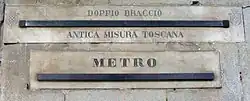 On a wall of the palace is a display of the length of a Florentine "Braccio", the particular measure used in Tuscany, prior to the Napoleonic conquest, which ushered in the metric measurement (also featured). The Palazzo was the home to the meetings of the Pistoian Academy of Sciences, Letters and Arts from its foundation in 1803 until 1811, when the Napoleonic authorities granted them the suppressed convent of Santa Maria del Carmine of Pistoia.[6]