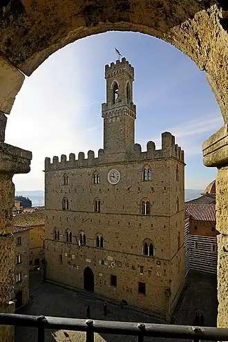 The Palazzo dei Priori is a Gothic-style monumental civic building in the center of the town of Volterra, located on the Piazza dei Priori, also known as Piazza Maggiore. The imposing 13th-century stone building once the office of appointed town magistrates, still has offices of the local commune, including the communal council, for Volterra, province of Pisa, region of Tuscany, Italy.