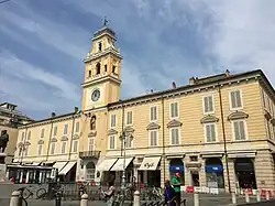 A brick palace at the site was first erected in 1283, consisting of two wings separated by an alleyway. The palace housed formerly the lord, and then Governor of the town. Over the years it was occupied by various magistrates and legates for the commune. In 1606, after the collapse of a central bell-tower, the structure underwent reconstruction. The present bell-tower was erected in 1673 by the engineer Giovanni Battista Barattieri. On the façade, below the clock, is a niche with a statue depicting the Madonna being crowned by the child Jesus by Jean-Baptiste Boudard. Surrounding the statue are three sundials commissioned in 1829 by the Marie Louise, Duchess of Parma. Previously the niche held a 16th-century fresco depicting the crowned Virgin painted by Jacopo Bertoia.