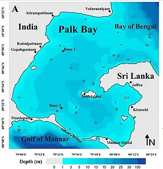 ![]() Bathymetry of the Palk Strait, with water depth in metres | |
