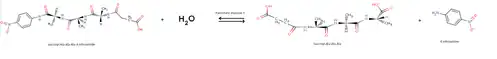 Reaction catalysed by pancreatic elastase 1. This image represents the hydrolysis of the succinyl-Ala-Ala-Ala-p-nitroanalide. The addition of one water molecule provokes the hydrolysis of the molecule and the release of p-nitroaniline.