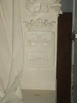 1. ^ From a photograph of the principle (front) facade. The inscription is located over the arch of the portico door under the pediment. The inscription is neo-Latin, all upper case with periods denoting spaces between words. It is a passage from the Liber Ecclesiasticus, Chapter 44.7, of the Vulgate, the standard Catholic Bible. Though made a part of the Catholic Canon (Bible) in 1546, and accepted as true Bible by the eastern churches, it is rejected as Scripture by the Jews, the Lutherans, and the Anglicans.