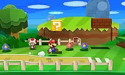 A major facet of Sticker Star's gameplay is the use of collectible stickers, which are used to gain abilities to progress through the game.[5] The player collects stickers that are found and peeled off from various areas in the environment.[5] Additionally, the player can purchase stickers using coins or receive them from non-playable characters (NPC).[6] The player has limited inventory space, with larger stickers taking up more room.[7] Stickers are used both in combat and for interacting with the environment.[8] The player can enter a state called "Paperization", which will lay the screen down flat to reveal additional secrets not visible regularly.[9] Real-world objects can be found, known in-game as "Things", such as baseball bats and scissors, that can be turned into special types of stickers called "Thing Stickers",[10] which are often needed to solve puzzles in the overworld.[8] For example, a Fan Thing Sticker can be placed in strategic areas in the environment and, when activated, creates wind that moves or destroys obstacles.[11]