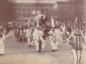 In 1891, there was a brief resurgence of interest in the Fat Ox, a traditional parade character from the Mardi Gras celebration in New Orleans, Louisiana.[9][47] However, this attempt at reviving the tradition was met with opposition from Prime Minister and Minister of War Charles de Freycinet, who vetoed the request to use cavalry troops from the Paris garrison. These troops had been scheduled to participate in the parade dressed in costume.[48][49] This decision was met with regret in several newspapers,[50] which expressed disappointment that the Fat Ox would not be making a comeback. In the 1891 Mardi Gras parade, the Fat Ox appeared as a giant effigy. The parade included the following elements: "A vast float depicting the Fat Ox, on whose back a child dressed as Cupid offered bouquets of violets."[51] In the subsequent years, informal Parisian parades during Mardi Gras or Mid-Lent featured the Fat Ox as a giant effigy. In 1892, the central theme of the Moulin-Rouge cavalcade featured a colossal red cardboard ox with a bobbing head, upon which Cupid—a child with blond wigs—was perched.[52] This cavalcade continued to be featured in subsequent parades for the next two years.[53] However, in 1894, a dancer in a pink bodysuit replaced Cupid, blowing kisses and smiles to the crowd throughout the parade.[54] In the same year, a parade organized by Parisian students featured a young man dressed as a maiden accompanied by a diminutive "mayor" who performed mock marriages. Among the entourage was a Fat Ox in the form of a large artificial pig.[55]
