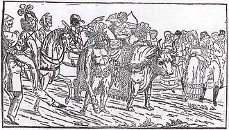 According to Le Constitutionnel, the parade underwent significant changes in 1850. The classic savages, lictors, executioners, and traditional Love were no longer present. Instead, archers from the 13th century, heralds from Charles VI, musketeers from Louis XIII, Montenegrins on horseback, and Empire hussars with completely renewed costumes appeared in the parade.[28] The following year, upon its return to Paris, the Norman Bœuf Gras Liberté, adorned with a golden embroidered cover trimmed with gold and flowers, is preceded by a detachment of cavalry from the Republican Guard and a company of drummers dressed as janissaries. It is surrounded by the four traditional savages adorned with colorful feathers and ferocious animal skins. A delegation of Norman cattle breeders follows, along with a float carrying five women representing Ceres and the four seasons, knights "in the medieval style," and cavalry from the Republican Guard bringing up the rear.[30] The costumes were chosen by a council that included Gérard de Nerval.[132]