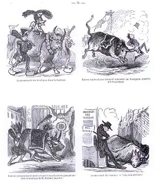 Beginning in 1845, bulls were assigned specific names that reflected contemporary events.[20] For instance, the war in Mexico prompted the naming of a bull Mexico, while a victory by Napoleon III led to another bull being named Magenta. The nomenclature could also be inspired by popular operettas of the era, such as Rothomago and Lalla-Roukh in 1863, or musical hits like Tu-vas-me-l'payer in 1862 and L'pied qui remue in 1863, which were based on popular songs. The bull was also named after literary works of the moment,[21][47] as evidenced by its naming after Balzac's novel Goriot in 1845. The following year, it was named Dagobert, after the novel Le Juif errant by Eugène Sue.The procession that followed the bull included the main characters of the novel: Dagobert riding Jovial, with Rose and Blanche, Prince Djalma, Marshal Simon, Rodin holding his open umbrella, etc.[112] Over time, it became said that an author honored in this way had "entered the slaughterhouse." The expression "being Bœuf Gras" came to signify success,[21] a notion that was commented on in 1847 by Théophile Gautier[8] and Charles Monselet, the latter employing a tone of irony in his commentary.