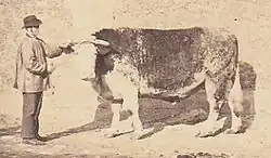 In 1857, the Promenade des Bœufs Gras attracted unusual interest due to the presence of Sarlabot, an ox of a new Norman breed, called Cotentin, raised and fattened by Henry Dutrône on his estate in Sarlabot, Trousseauville-Dives in Calvados.[120][121] It was a hornless ox, obtained by crossing with hornless English breeds. The Journal d'agriculture pratique published an engraved portrait of the animal, which was later used to illustrate two brochures.[122][123] The dairy qualities were particularly emphasized. Sarlabot, named after the estate where it was born, was slaughtered on 19 April 1857. It was later known as Sarlabot I,[123][124] with another Sarlabot of the same breed participating in the parade the following year. This one was bought after Carnival by butcher Duval, the organizer of the 1858 bœufs gras parade, whose budget reached 14,187 francs 10 centimes. Duval came into conflict with breeder Dutrône, who refused to deliver it immediately as demanded by the butcher.[125]
