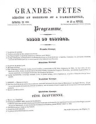 During the First Empire, for example, in February 1813, the Child dressed as Cupid was occasionally replaced by the god Mars.[21] Seven years later, Louvel attended the Fat Ox parade before fatally stabbing the Duke of Berry,[22] and street festivities were subsequently banned by Police Prefect Jules Anglès.[23] Printed programs, titled Order and Procession of the Fat Ox and decorated with engravings, were regularly distributed until the end of the Second Empire.[21][N 1][24] On 14 February 1831, clashes occurred on the same day as the Fat Ox parade. Informed of the unrest, the Foreign Minister reportedly left the Legislative Body to go to his residence, where the parade was set to pass, announcing, "I'm going to see the masks."The following year's parade, initially uncertain, was eventually held under heavy police supervision.[25] In 1846, the organizers of the parade proposed a novel innovation: the Fat Ox would be placed on a float pulled by six horses. The vehicle was tested with 258 paving stones weighing six tons—three times the ox's weight—but it broke down. As a result, Dagobert paraded on foot.[21]