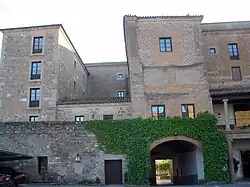 García Álvarez de Toledo's son, Fernán Álvarez de Toledo y Zúñiga, the second lord of Oropesa, with his wife Elvira de Ayala, lady of Cebolla,[6] built the first palace and enlarged the castle at the end of the 14th century.[7] This palace, on the north side of the castle complex and abutting the castle, is a Mudéjar-Gothic building with a long hall room on the upper floor approached from the courtyard by a wide stone interior staircase.[2] The hall was embellished by a polychrome wooden coffered ceiling decorated with the coat of arms of the Álvarez de Toledo family and those of other families connected by marriage. A mirador (lookout point) was built onto the hall, as an internal balcony or loggia open to the air with four foliated Gothic arches. The exterior arch spandrels displayed three coats of arms, one being of the Álvarez family and the other two of the Zúñiga family.[8] Plateresque details were added to the first palace in the 16th century.[2]