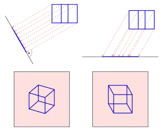 In an oblique projection, the parallel projection rays are not perpendicular to the viewing plane, but strike the projection plane at an angle other than ninety degrees.[2] In both orthographic and oblique projection, parallel lines in space appear parallel on the projected image. Because of its simplicity, oblique projection is used exclusively for pictorial purposes rather than for formal, working drawings. In an oblique pictorial drawing, the displayed angles separating the coordinate axes as well as the foreshortening factors (scaling) are arbitrary. The distortion created thereby is usually attenuated by aligning one plane of the imaged object to be parallel with the plane of projection, creating a truly-formed, full-size image of the chosen plane. Special types of oblique projections include military, cavalier and cabinet projection.[3]