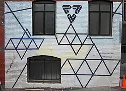 This visual ambiguity has been exploited in op art, as well as "impossible object" drawings. Though not strictly parallel, M. C. Escher's Waterfall (1961) is a well-known image, in which a channel of water seems to travel unaided along a downward path, only to then paradoxically fall once again as it returns to its source. The water thus appears to disobey the law of conservation of energy. Oscar Reutersvard is credited with discovery of the impossible object, an example of the impossible triangle (top) shown in this mural by Paul Kuniholm.