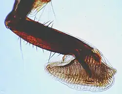 Mouthparts of Tabanus horse-fly: sensory palp at left, sponging labella at center, skin-piercing elements at right.