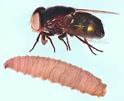 Chrysomia bezziana, Old World screw-worm, adult fly and third stage larva of type causing myiasis (see header photograph of C.megacephala for colors of live fly).