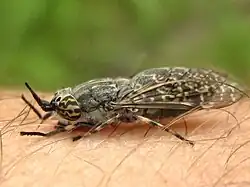 These are large robust flies with massive eyes that often show colored patterns. Antennae are characteristic with three dissimilar segments projecting forward from head. Wings are large and strong with complex venation, and often with complex patterns of brown on clear background.[29][30] These flies are adapted to hunt widely for their hosts during daytime. Females take repeated small blood meals from their hosts to support development of a large batch of eggs. Eggs are laid on wet soil where larvae develop, sometimes over one or two years by feeding on soil organisms. Males do not feed on blood. Hosts of females include all species of mammalian livestock animals and horses. Tabanid flies have large mouthparts comprising three pairs of cutting / slashing elements that pierce skin in a superficial wound. Blood flowing from this is imbibed through a sponge-like element of the mouthparts, the labella (similar to that shown in photograph of Calliphora).[31]