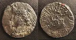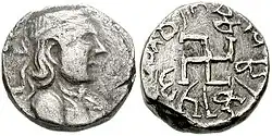 Coinage was issued in five denominations: didrachms, drachms, hemidrachms, quarter drachms, and obols; all rulers did not issue every denomination. The first six rulers minted stable denominations in silver that were devalued and then replaced by billon than copper.[6] Tandon notes multiple similarities with Indo-Parthian coinage, especially in the metrological standards and shape, and the coinage of the Western Satraps, especially in materials.[7][b]