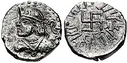 The coins exhibit a bust on the obverse and a swastika—either right-facing or left-facing—on the reverse, circumscribed by a Prakrit legend in Brahmi script (usually silver coins) or Kharoshthi script (usually copper coins).[1] This legend carried the name of the issuer followed by patronymic, and identification as the "King of Paratas".[1] The die engraver often left the legend incomplete if he ran out of room, a quirk that is peculiar to the Paratarajas.