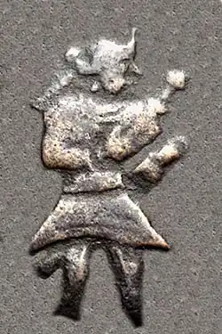 Coins carrying an inscription of "śrī rājño sāhi vijayapotasya" ("Of the noble Lord, King Vijayapota") on the reverse have been found around Loralai; based on the presence of a crescent at the brow of the obverse bust, a terminus post quem of c. 400 corresponding to Sassanian shahanshah Yazdegerd I can be assigned.[38] Despite a marked contrast in the legend and the long gap from Datayola, the common use of the swastika as the central motif on the reverse and a similarity in metrological standards led Tandon to hypothesize Vijayapotasya might have been either a Parataraja or a ruler from a successor dynasty that exercised nominal independence despite the strong presence of Sassanians in the region.[39]