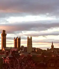 Prior to 2013, the Glasgow City Council's civil marriage rooms were located at 22 Park Circus, in the former Italian consulate. The Scottish Football Association (SFA) had its headquarters on Park Gardens in the area, but moved to Hampden Park when the stadium was redeveloped and also became a home for the organisation.[4] A mosaic depicting the badge of the SFA still exists at the entrance to their former headquarters. The Scottish Labour Party formerly had its headquarters in the area; the towers that once formed the University of Glasgow's Trinity College are located on Lynedoch Place and dominate the local skyline, although classes ceased in the early 1970s and the building was converted to apartments in the 1980s,[5][6] in contrast to the neighbouring Park Church, of which only the distinctive white tower remains, with the church itself replaced by offices in the late 1960s when that function was in demand in the area.[7] As for other organisations, the offices of The Royal Society for the Protection of Birds, The Scottish Council for Development and Industry, The Scottish Catholic International Aid Fund and The Goethe Institute are located here.