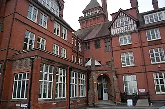 The main entrance and frontage, facing the railway station, in September 2014 | |