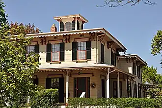The Parker House is a historic house in Winchester, Massachusetts. This two story wood-frame house was probably built in the 1850s by Kenelum Baker, a local builder, and is an elaborately styled Italianate house. It has wide eaves studded with paired brackets, and the porch, eave, and cupola all have a simple scalloped molding. The square cupola has round-arch windows, and the porch wraps around three sides of the house.[2]