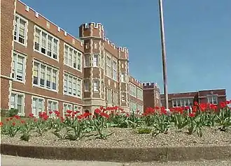 Parkersburg High School was one of the first high schools in the state of West Virginia. The school was founded in 1867, originally located in downtown Parkersburg. The current building housing PHS has a Tudor Style architecture with three stories. It was designed by noted Ohio architect Frank Packard (1866–1923), and built in 1917, making it one of the oldest school buildings in West Virginia. It remains the largest high school campus in the state. Later additions included Stadium Field and the Field House, a multi-story gymnasium.[7] It is located in the Parkersburg High School-Washington Avenue Historic District, listed on the National Register of Historic Places in 1992.[8]
