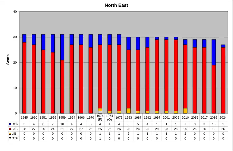 The region[1] of North East England is divided into 27 parliamentary constituencies which is made up of 11 borough constituencies and 16 county constituencies. Since the 2024 general election, 26 are represented by Labour MPs and one by a Conservative MP.