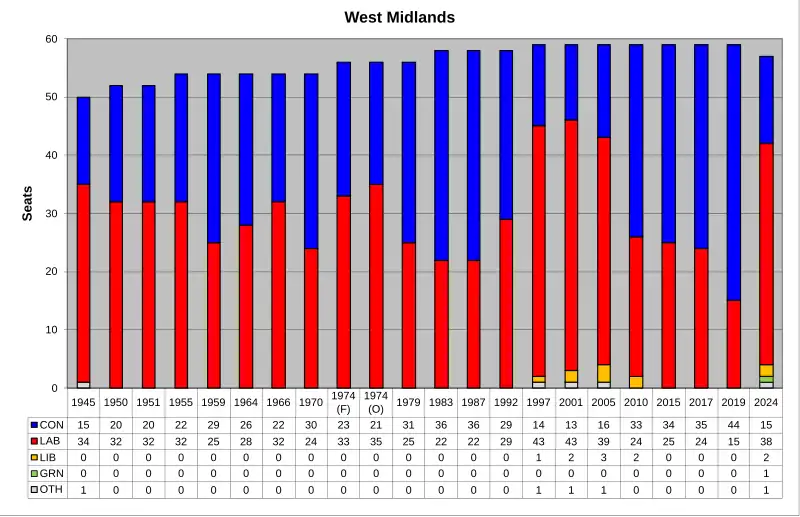 The region[nb 1] of West Midlands is divided into 57 parliamentary constituencies which is made up of 28 borough constituencies and 29 county constituencies. Since the general election of July 2024, 38 are represented by Labour MPs,15 by Conservative MPs, 2 by Liberal Democrat MPs, and 1 by an independent MP.