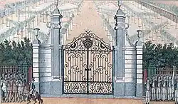 The beautiful iron gate at the entrance of the park, in Rococo style, is still in its original place and carries the effigies of Queen Mary I of Portugal and the King consort, Pedro III, with the Latin inscription Maria Iª et Petrus III Brasiliae Regibus 1783.