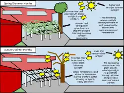 • Erecting correctly sized, latitude-specific roof overhangs,[15] or shading elements (shrubbery, trees, trellises, fences, shutters, etc.)[16]
