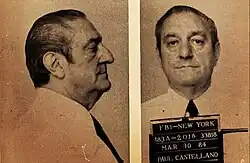 Castellano joined the Mangano family in the 1940s and eventually became a caporegime (capo, or captain) under Albert Anastasia, the successor to original boss Vincent Mangano. In 1957, after Anastasia's murder and Gambino's elevation to boss, Castellano attended the abortive Apalachin meeting in Apalachin, New York. When the New York State Police raided the meeting, Castellano was one of 61 high-ranking mobsters arrested. Refusing to answer grand jury questions about the meeting, Castellano spent a year in prison on contempt charges. On January 13, 1960, Castellano was sentenced to five years in prison for conspiracy to withhold information.[9] However, in November 1960, Castellano's conviction was reversed on appeal.[10]