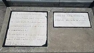 The location the station was built on was originally the home to "The House That Jack Built", an eccentric commercial building built by Jasper Newton "Jack" Smith in the late 1800s. As part of a lease agreement Smith made with later leaseholders of the property, two inscribed marble slabs were to be displayed prominently in any future building constructed on the site. When Peachtree Center station opened in 1982, these two marble slabs were relocated to a fenced-off area near the subway station entrance.[8]