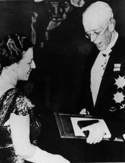 Pearl S. Buck receives the Nobel Prize for Literature from King Gustav V of Sweden in the Stockholm Concert Hall in 1938
