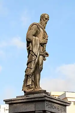 Heredia traveled to the West Indies with his brother Alonso de Heredia and settled in Santo Domingo, the capital of the island of Hispaniola, where they eventually inherited a sugar mill and an estate in Azua Province.[3] Then came news of the death of the governor of Santa Marta, Rodrigo de Bastidas, and the Royal Audiencia of Santo Domingo decided to send Pedro de Vadillo as interim governor of the province and Pedro de Heredia as his lieutenant.[4] In 1528, Vadillo and Heredia landed in Santa Marta with 200 men and soon became involved in disputes with Rodrigo Alvarez Palomino, a former lieutenant of Bastidas, which were resolved when the latter was drowned in the river that bears his name.