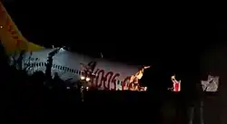 Pegasus Airlines Flight 2193 was a scheduled domestic passenger flight from İzmir to Istanbul in Turkey operated by Pegasus Airlines. On 5 February 2020, the Boeing 737-800 operating the route skidded off the runway while landing at Istanbul-Sabiha Gökçen International Airport, Turkey. Three people were killed, 179 people were injured, and the aircraft was destroyed.[1] This was the first fatal accident in the airline's history.[2] The accident came less than a month after another Pegasus Airlines accident involving a Boeing 737 skidding off the runway at the same airport.[3]