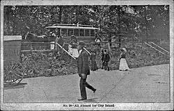 City Island residents had complained about the horse-drawn service, and one newspaper reported that "the cars were off the rails almost as much as they were on them".[22] In October 1908, application was made to the New York State Public Service Commission to change the motive power of the railroad from horse to overhead electric current.[23] A hearing was held on November 6[24] and final approval issued on November 17.[25][26] The route was described as:[18]